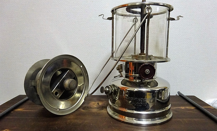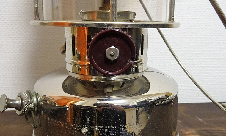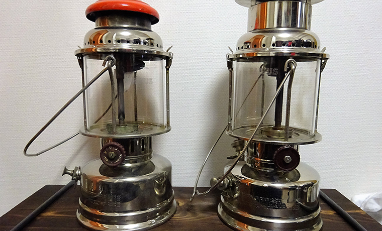 左は現行だとペトロマックス500HKと同じ、その他300CPのと同じ大きさのもの。(フシミバタフライ) 横幅的にはあまり変わらないですが背は低いですね。 あ、あと忘れていましたが取っ手の部分(ハンドル)がくるっとなっているのも特徴です。